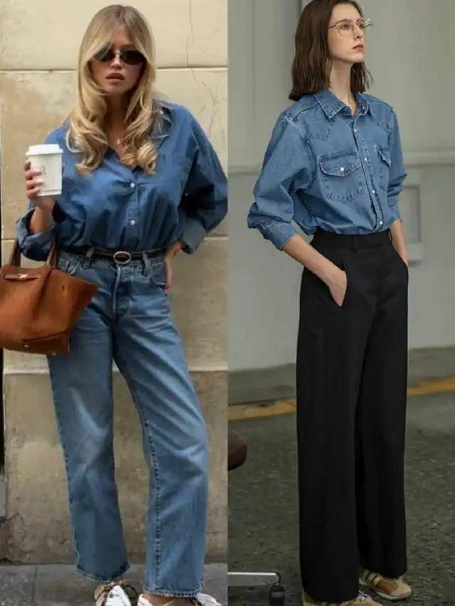 如果想换一种沉稳又有时尚感的搭配,可以选择一件蓝色的牛仔衬衫加上黑色的西装直筒裤,脚踩一双德训鞋,低调又有质感。让穿搭者呈现出一种高级从容的气质。