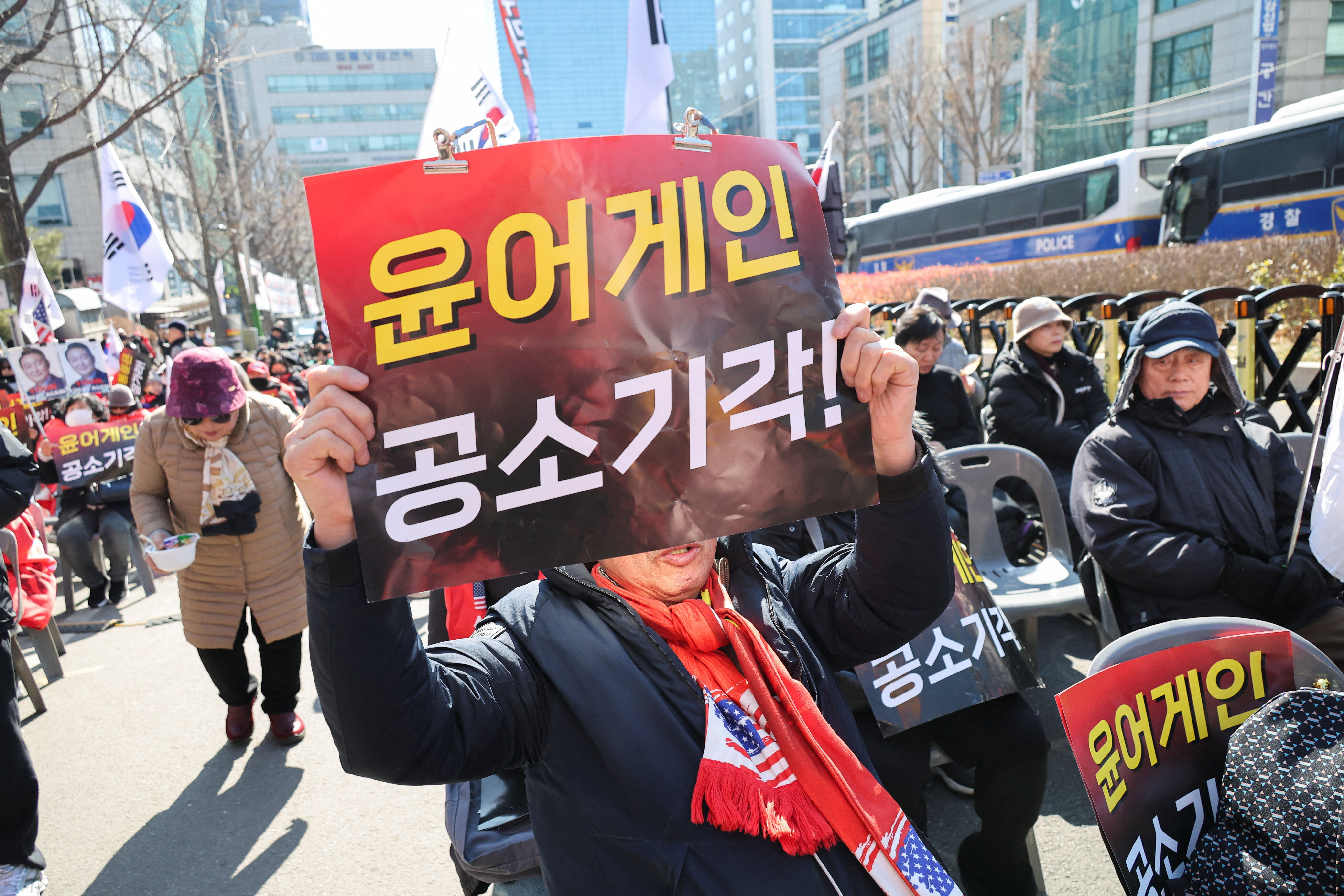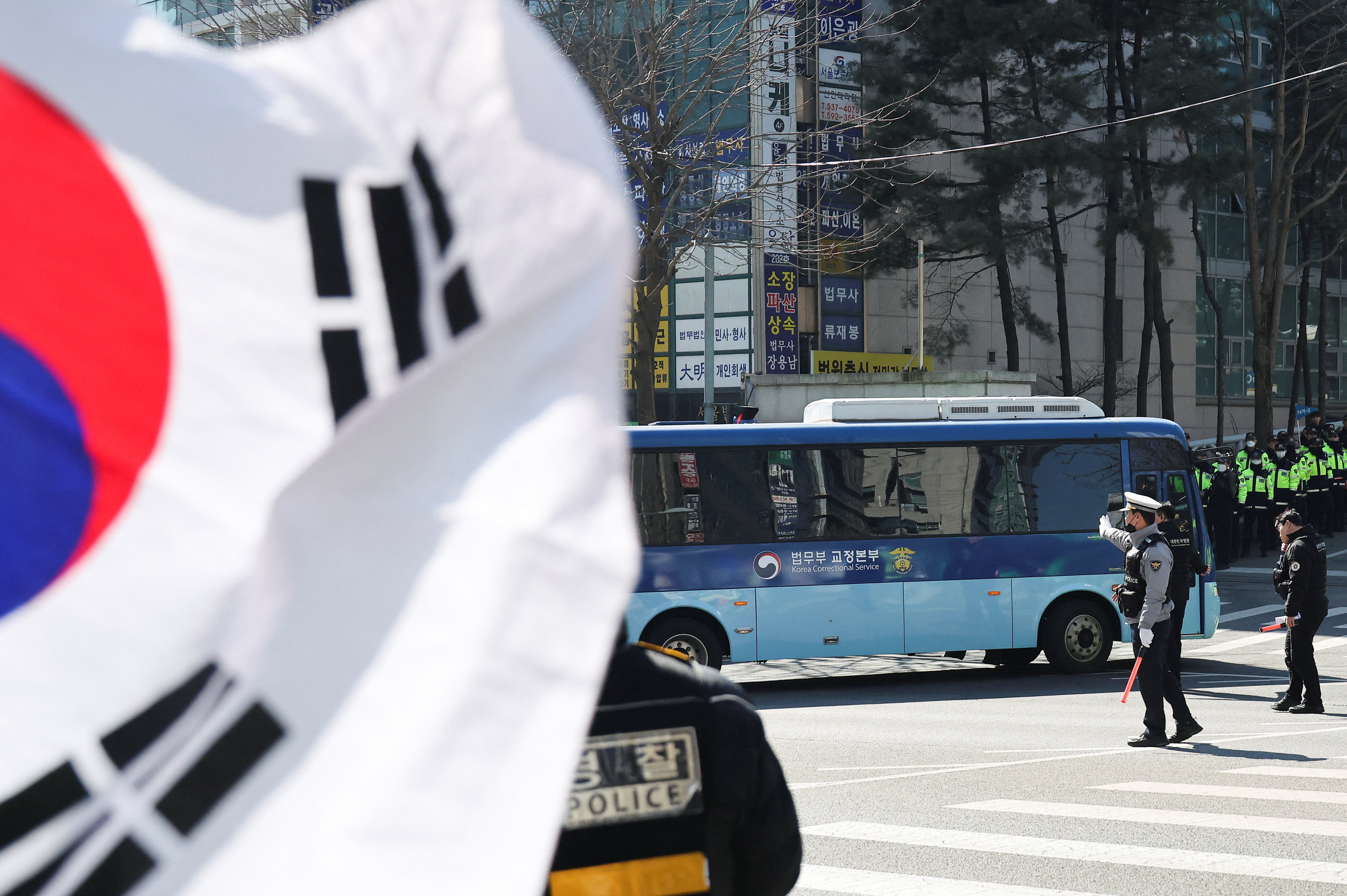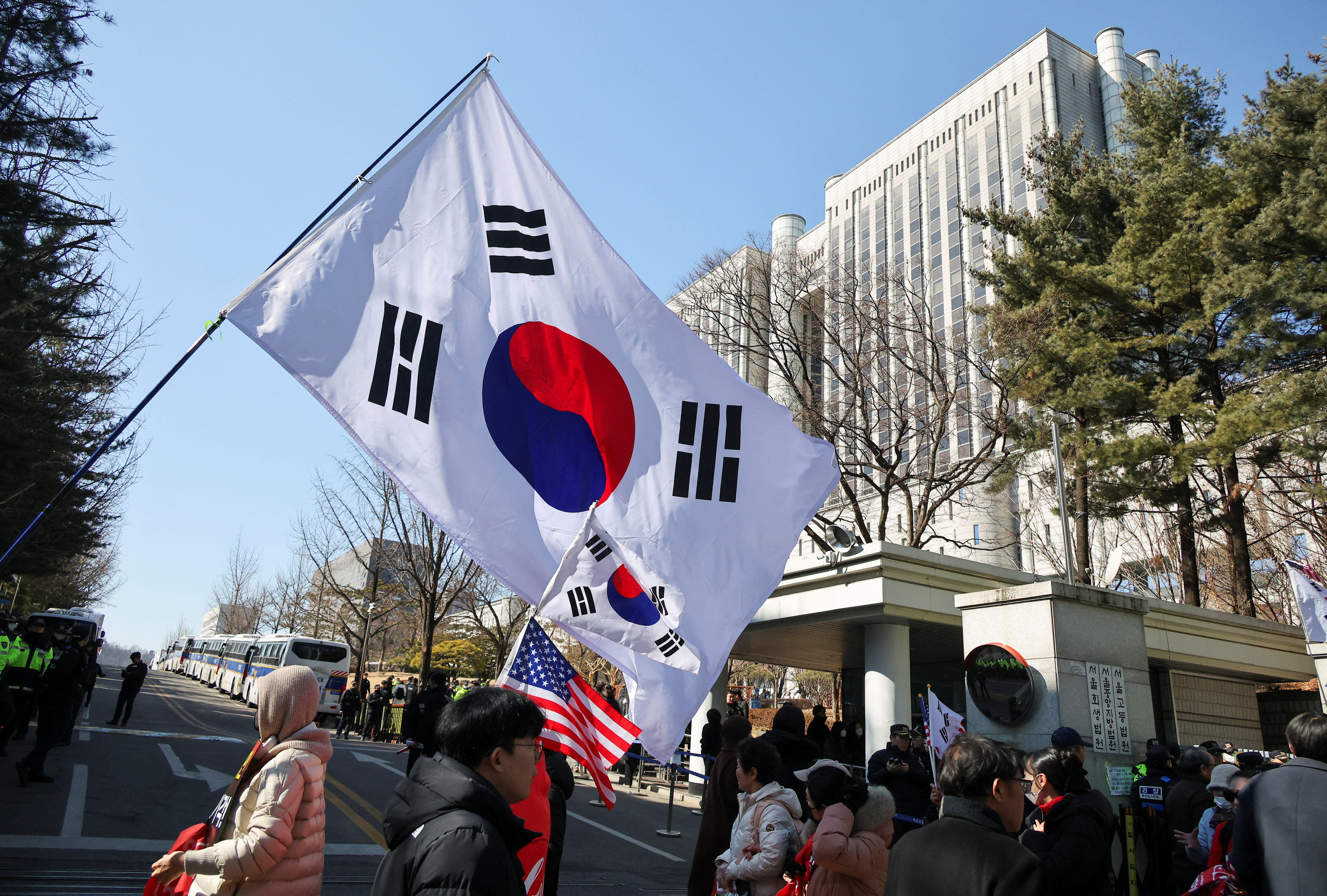 韩媒《朝鲜日报》指出,19日早晨,首尔中央地方法院周边气氛紧张,法院正门前已排满数十辆警察巴士形成防护车墙,法院至检察厅的道路设置安全围栏,横越路口亦布置路障,行人与车辆出入受限,机动警察16个中队(约1000人)全力待命,以防不测。