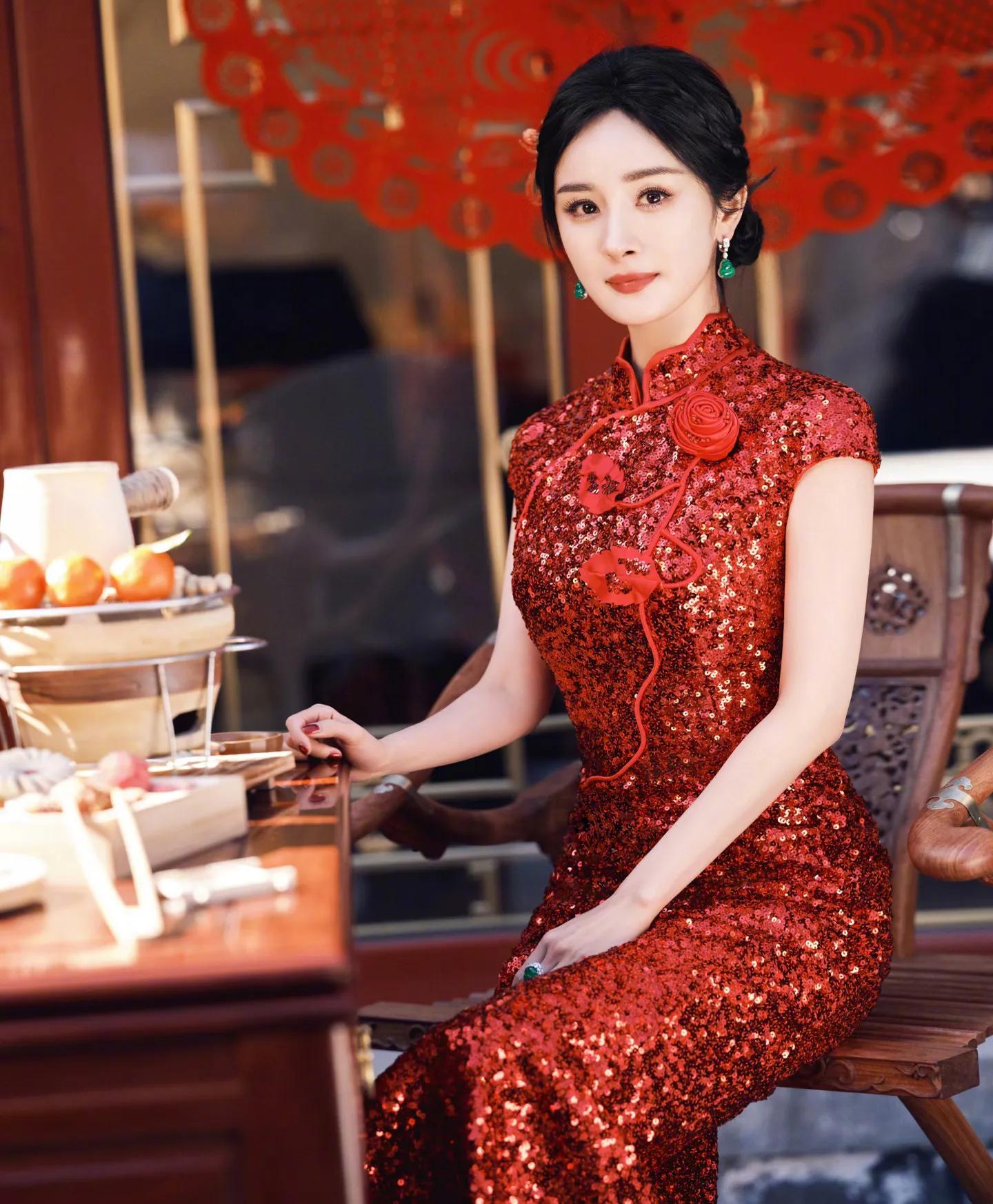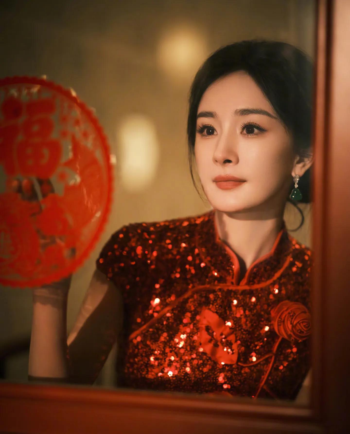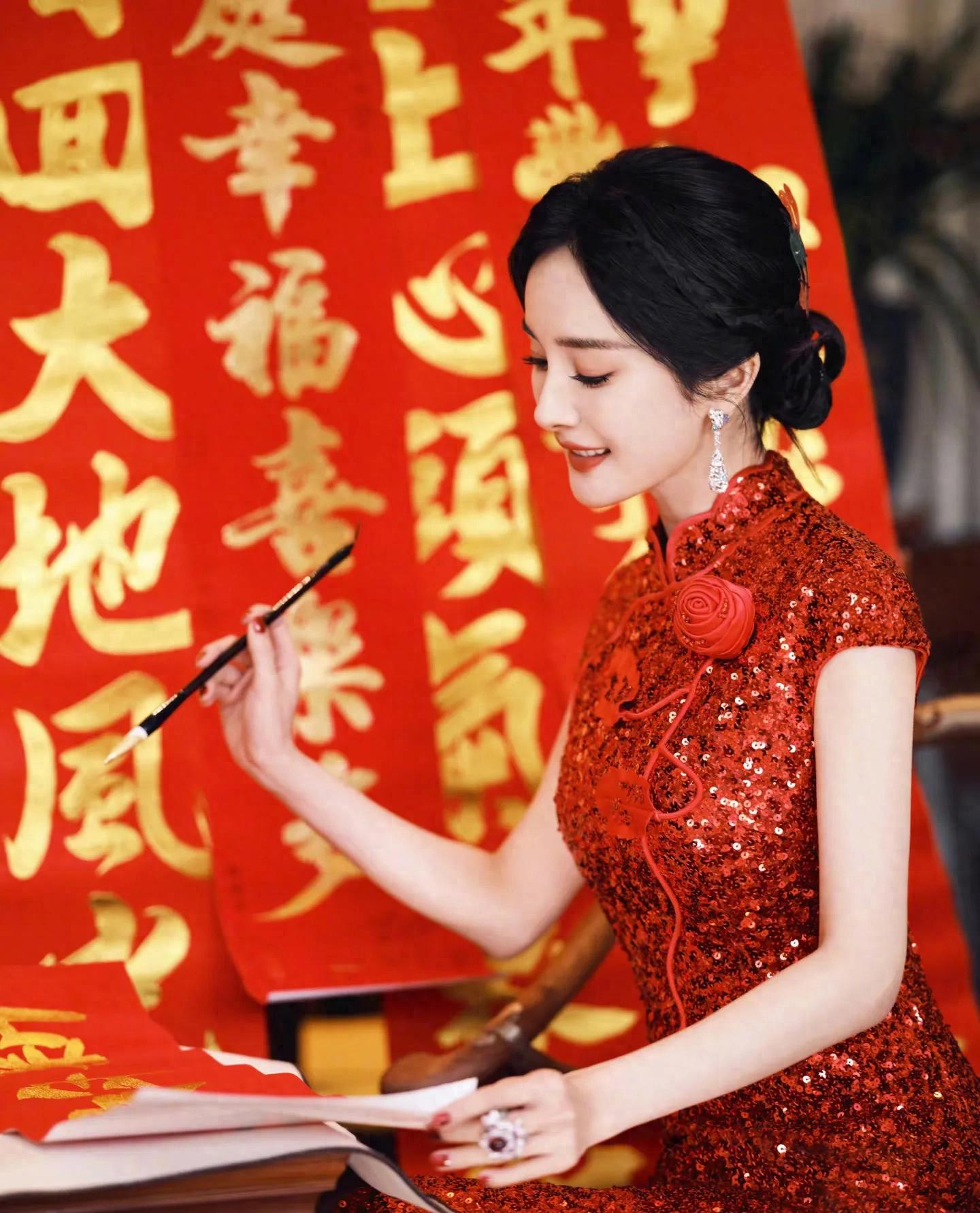 这组大片完美融合传统年味与时尚感,杨幂两套红色造型各有韵味。第一套红色亮片旗袍修身显瘦,盘发造型温婉大气,她手持毛笔写福字、举着“新年快乐”红幅,身后满墙金粉春联,烟火气拉满。另一套红色亮片礼裙搭配国粹戏曲造型搭档,红蓝撞色间尽显东方美学,既摩登又有文化底蕴。