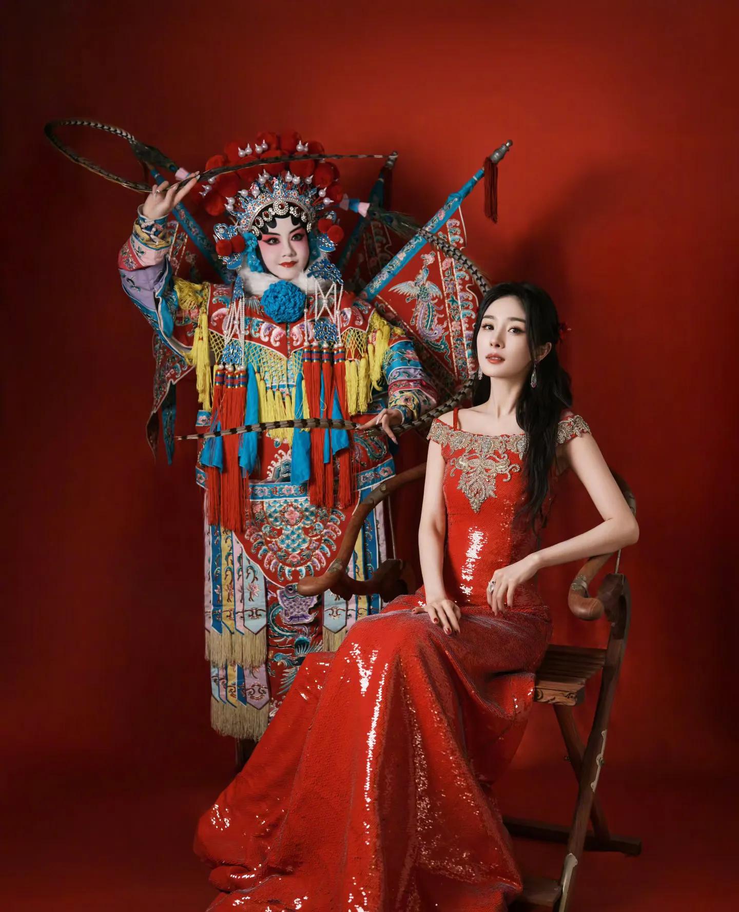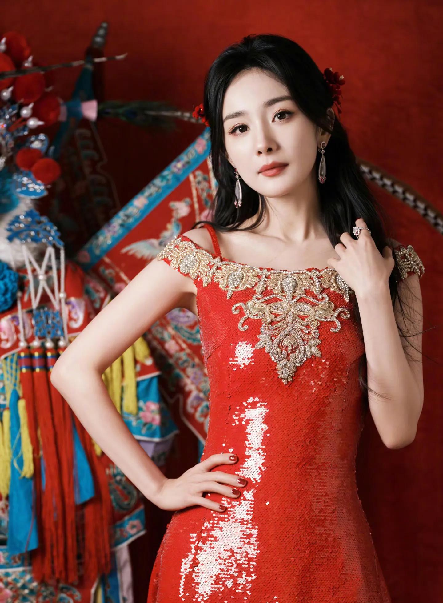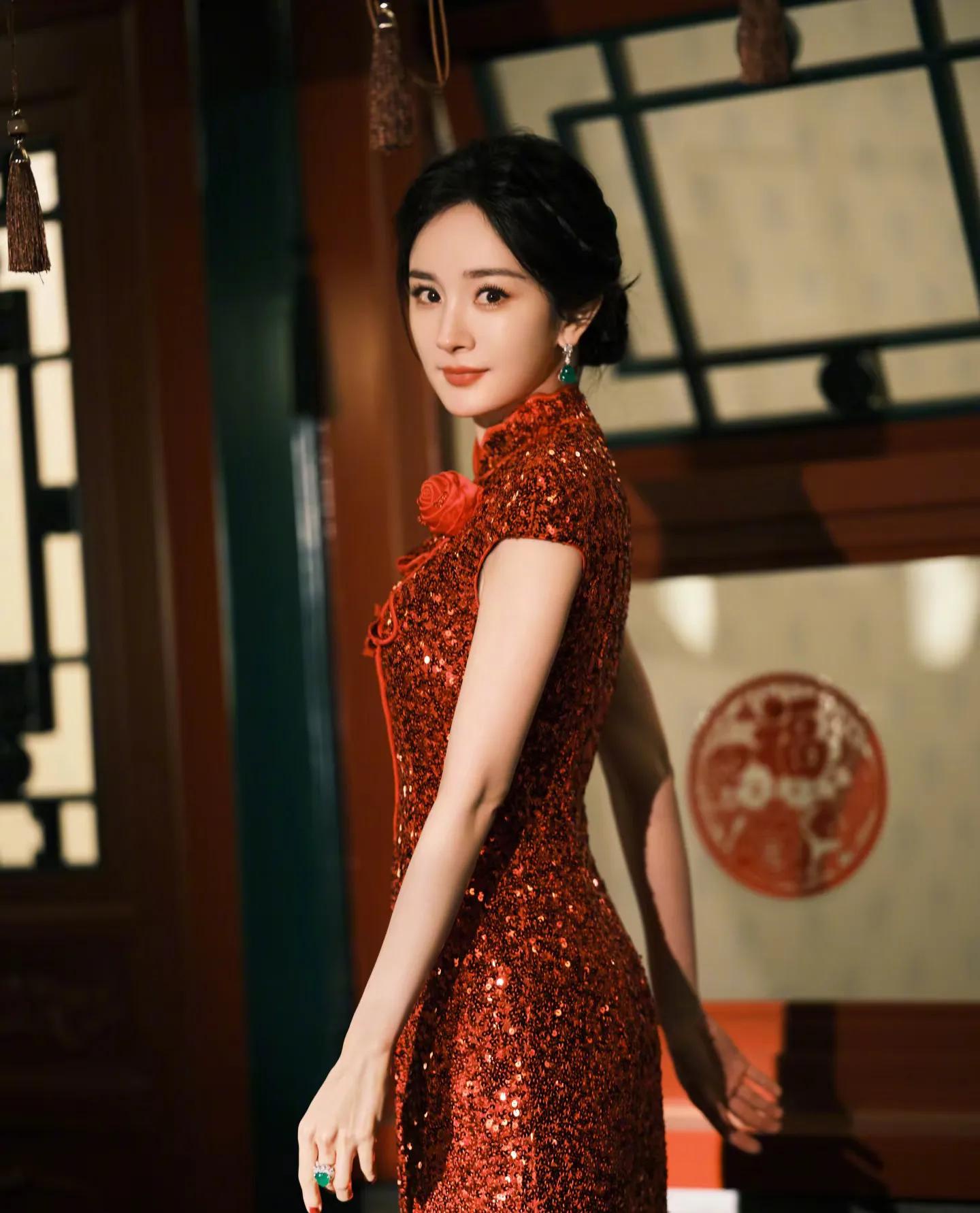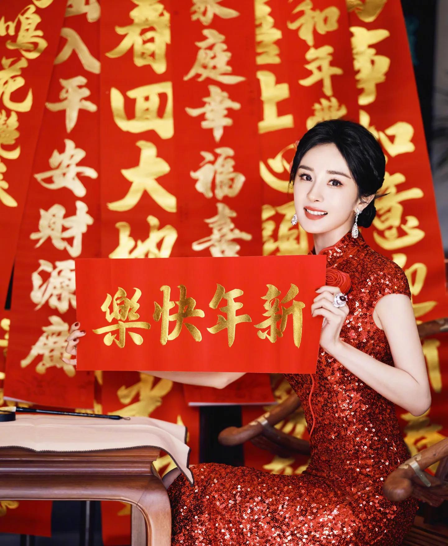 这组大片完美融合传统年味与时尚感,杨幂两套红色造型各有韵味。第一套红色亮片旗袍修身显瘦,盘发造型温婉大气,她手持毛笔写福字、举着“新年快乐”红幅,身后满墙金粉春联,烟火气拉满。另一套红色亮片礼裙搭配国粹戏曲造型搭档,红蓝撞色间尽显东方美学,既摩登又有文化底蕴。