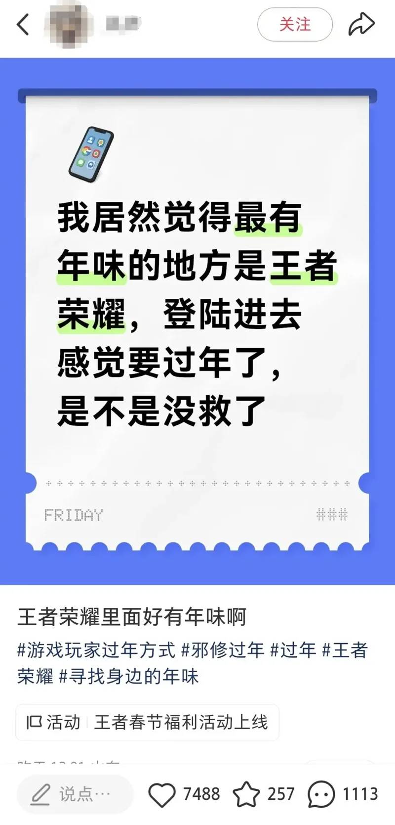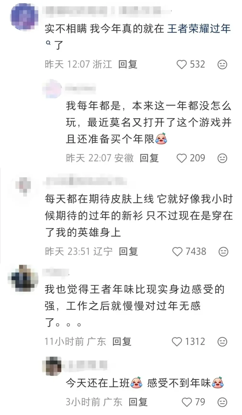 更有人直白地表示:“实不相瞒,我每年都在《王者荣耀》过年。”