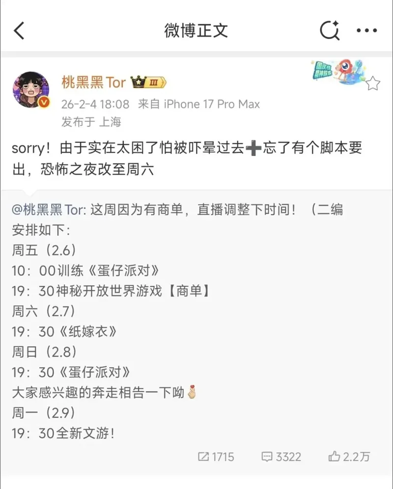 桃黑黑不得不在当晚录制并发布了一则长达47分钟的视频回应争议。这场看似荒诞的争执,也说明观众看他的直播,或许并不在意他游戏玩得多好、段子多爆笑,只是习惯了在每天的固定时间,屏幕那头有个人陪着说说话、打打游戏。桃黑黑的对网友来说,就像一碟下饭的“电子榨菜”,也像一位平平淡淡唠嗑的老朋友。