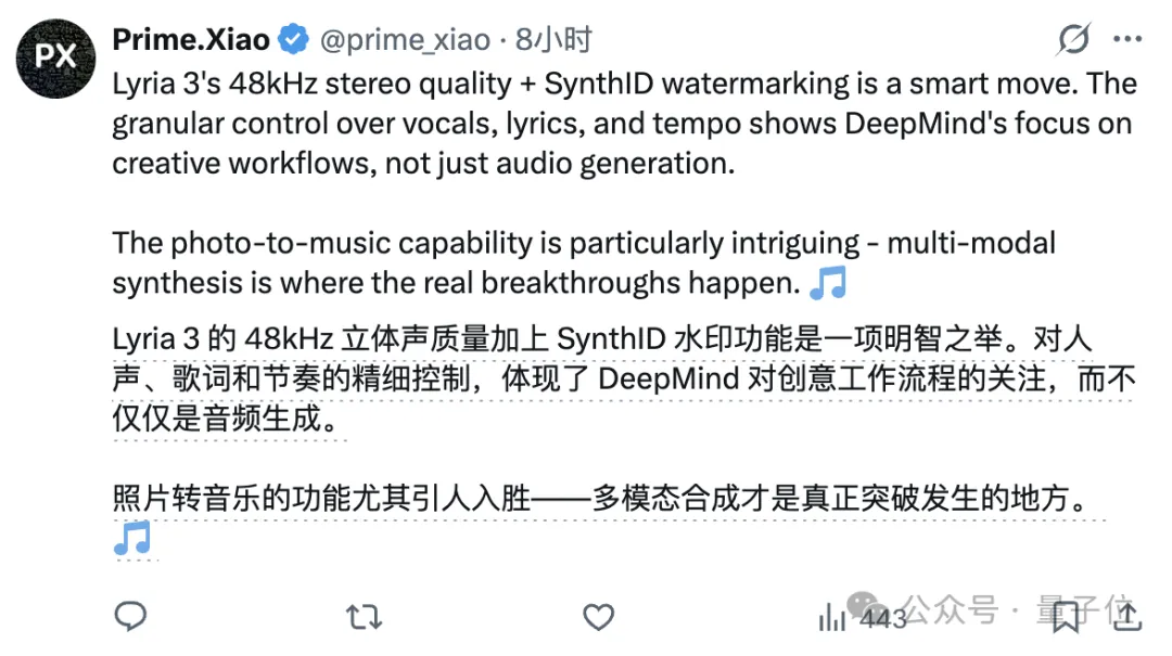网友评价,48kHz的立体声质量,加上根据照片生成音乐的功能,可见DeepMind这一波非常注重创意工作流程。