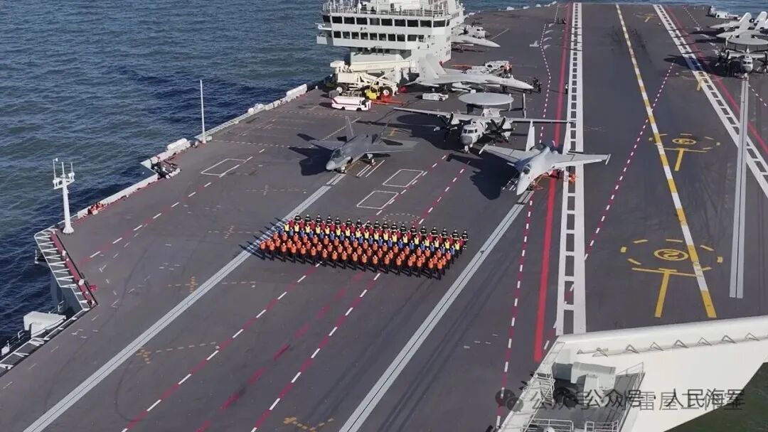 “人民海军”官方公众号今天(16日)发布的推文中,福建舰携多架舰载机送来新春祝福。甲板上可见3架歼-35、3架歼-15T和3架空警-600,一共9架,从机号可以看出都是之前用于测试的原型机。