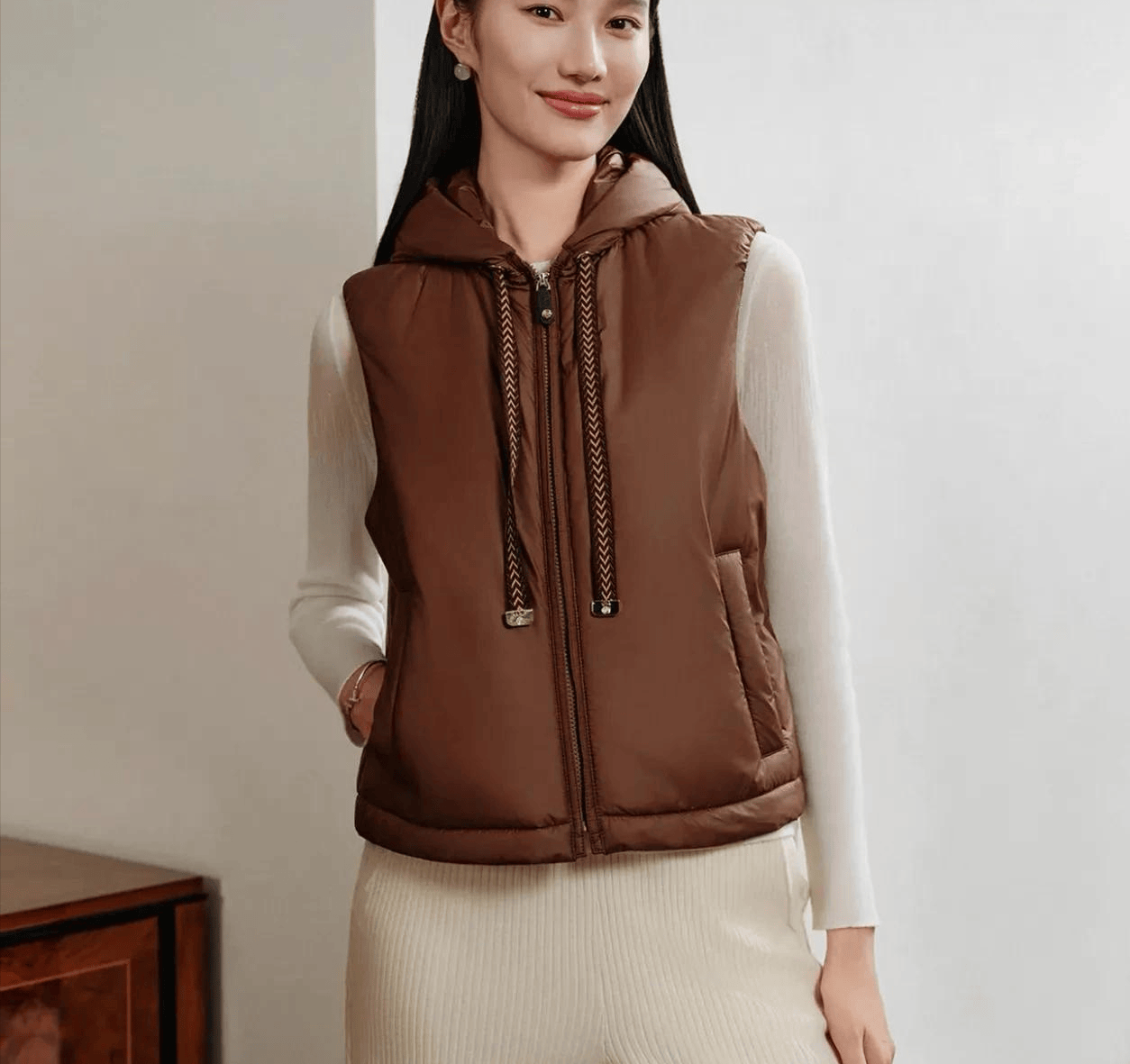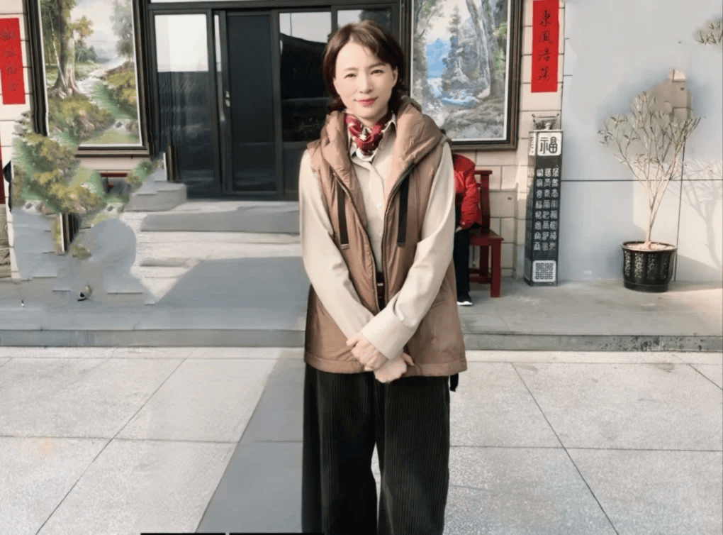 她穿得很克制。卡其色羽绒马甲据说三千元左右,里面是米色衬衫,脖子系着红色印花围巾,下身是墨绿色条纹裤。颜色都不张扬,偏偏组合在一起很“过年”:喜庆有了,稳重也有了。
