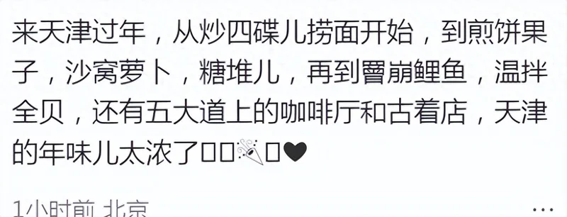 2月19日晚,演员朱珠在个人社交平台晒出系列照片分享春节假期动态。而从朱珠的附文来看,婚后和圈外老公王昀佳定居在北京生活的她,今年去了天津过年,吃了天津各种美食的朱珠开心表示:“天津的年味儿太浓了。”