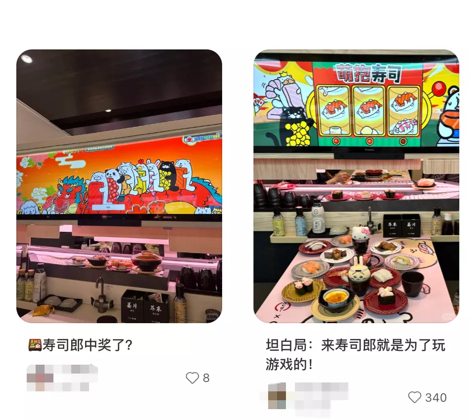 此外,寿司郎在华北和华东新门店引入了1.5米点单大屏,围绕着大屏展开的点餐、抽奖、游戏环节,也进一步将用餐过程娱乐化。