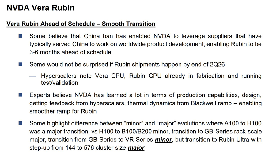 据华尔街见闻此前文章,Evercore的调研还指出了产品代际演进的差异,一些业内人士强调了"minor"(小幅演进)和"major"(大幅演进)之间的区别。其中从H100到B100/B200被视为minor过渡,而到GB-Series机架级系统是major演进,从GB-Series到VR-Series是minor,但到Rubin Ultra的过渡伴随着集群规模从144扩大到576则是major升级。