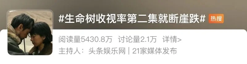 这部剧叫《生命树》。正午阳光出品,由曾任《琅琊榜》《伪装者》导演的李雪执导,杨紫、胡歌主演。顶配的班底,让它未播先热。开播当晚,酷云峰值冲到2.38%,刷新央视八套2026年收视纪录。