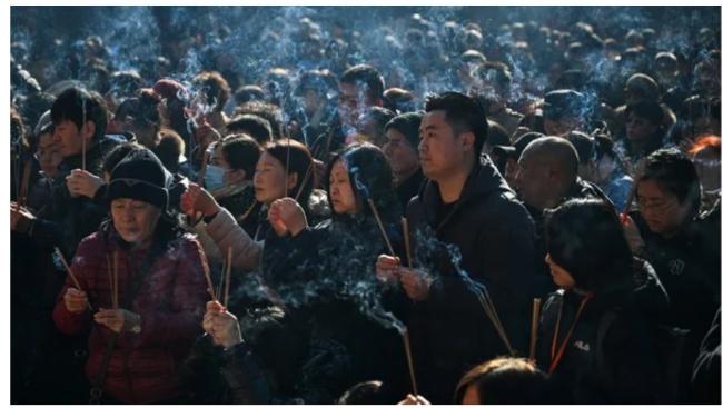 2026年2月17日,农历马年元旦,人们在北京雍和宫焚香祈祷。(Adek BERRY / AFP via Getty Images)