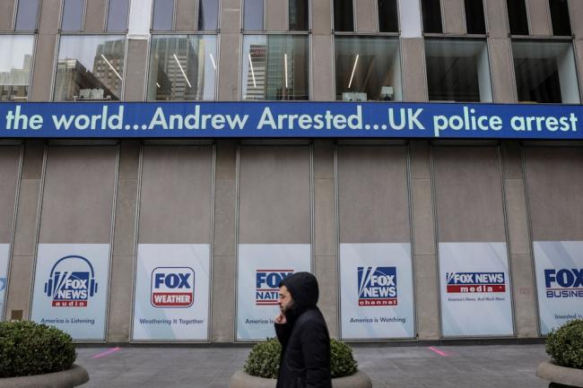 图为2026年2月19日,美国福克斯新闻(Fox News)的总部大楼外打出“安德鲁被捕”的新闻滚动字幕。当日英王查理斯三世(King Charles III)的胞弟、前王子安德鲁(Andrew Mountbatten-Windsor),因涉嫌公职人员行为不当被捕。(Reuters)