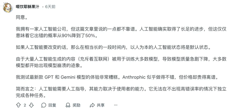 但就在这篇文章刷屏的同时,另一群每天需要用AI干活儿的人却吵翻了天——赞同者自然不少,但持不同意见的人也并不是少数。