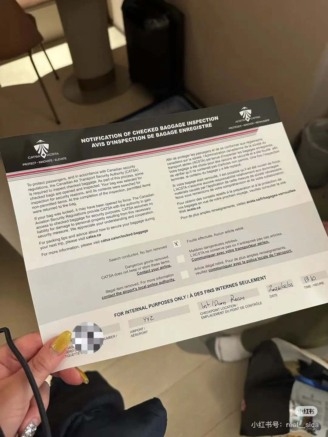网友C从加拿大回国后,发现托运行李箱上贴有海关的检查通知单,显示行李已被开箱查验。