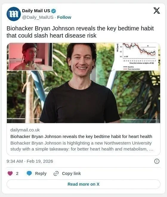 以极端自我优化著称的生物黑客(Biohacker),即健康极客布莱恩·约翰逊( Bryan Johnson)近日分享了一项关于最佳睡前进食时间的新研究,并提出健康生活建议:睡前三小时停止进食,有助于心脏和代谢健康。