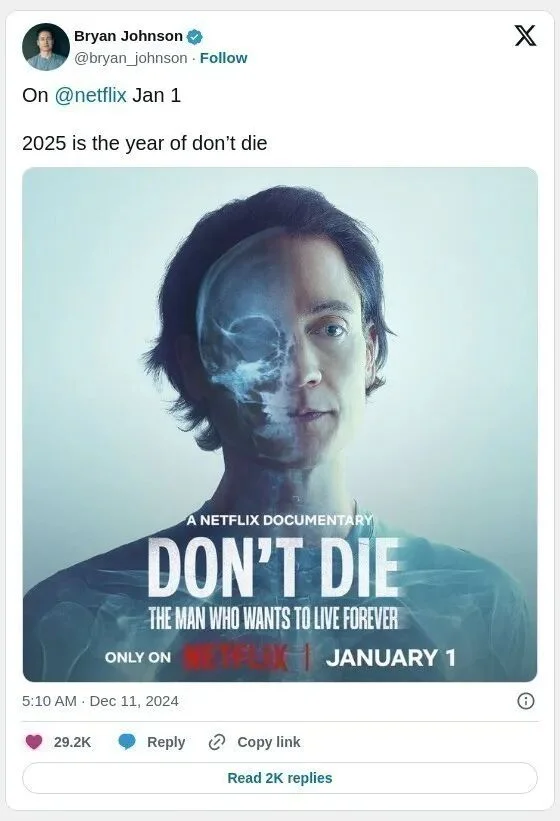布莱恩·约翰逊(Bryan Johnson是健康科技和生物优化领域的网红,他极端自我优化 、把自己当作实验对象追求“用科技延长健康寿命”, 每天严格管理饮食、睡眠、运动和身体指标,通过血液检测、心率监测等科学手段优化健康。