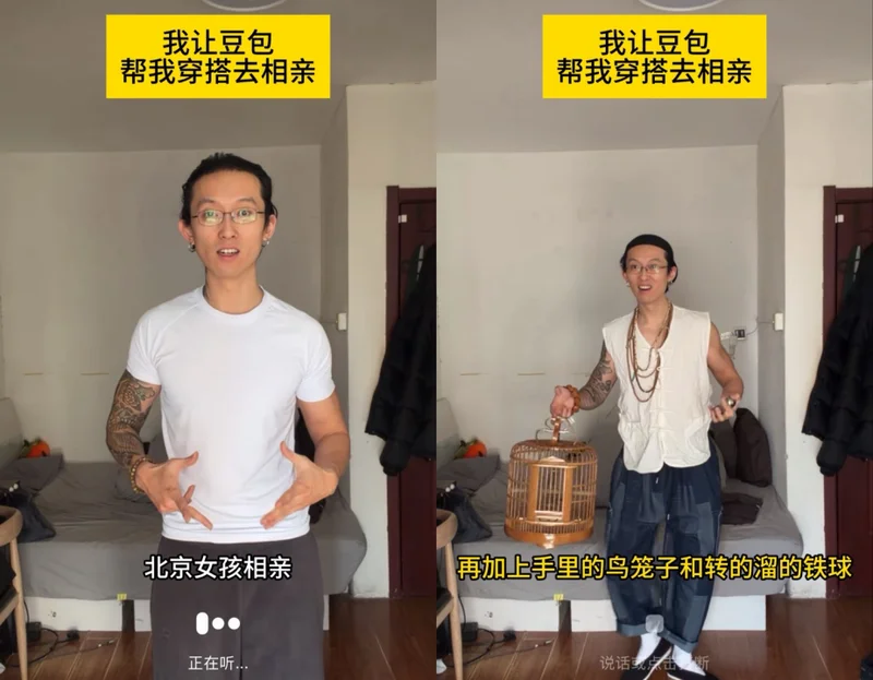 如果告诉对方自己要和一个北京姑娘相亲,那AI必给你打扮成胡同里遛鸟的大爷,一手鸟笼子、一手盘串或者转铁球,那叫一个AUV地道地地道道……