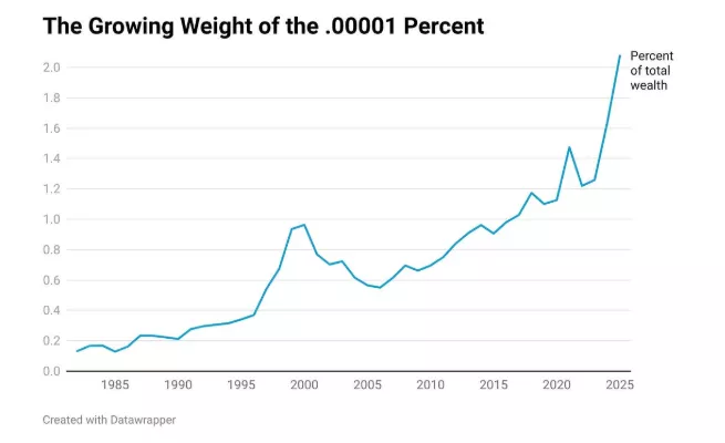 上个月,我采访了加布里埃尔·祖克曼,他是世界领先的财富不平等专家之一。祖克曼一直在制作关于最顶层财富的图表——占比0.00001%,目前意味着19人。他向我分享了最新数据,如下所示: