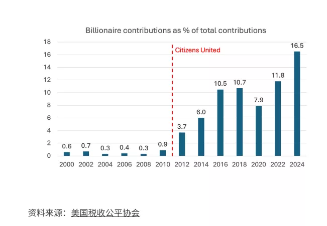 此外,政治支出的常规衡量标准显示,亿万富翁为影响美国选举而投入的资金激增。自罗伯茨领导的最高法院作出“公民联合”裁决以来,亿万富翁资金在全部政治捐款中所占比例急剧上升。
