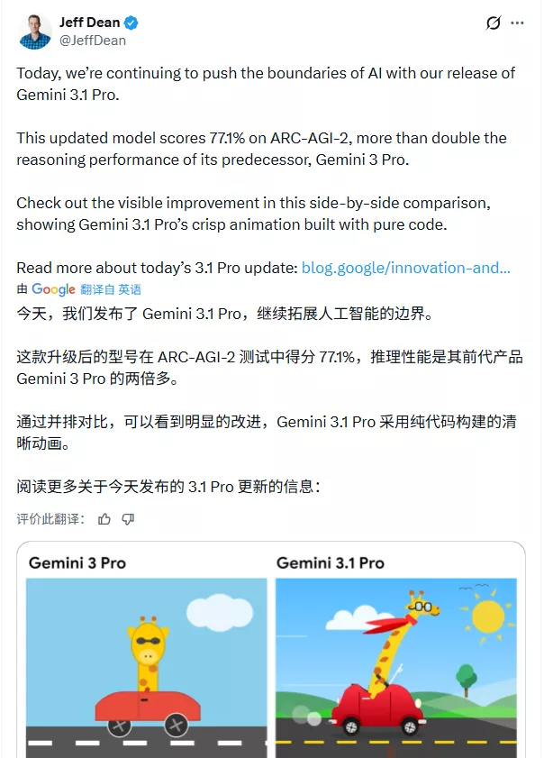 谷歌DeepMind的首席科学家杰夫·迪恩(Jeff Dean)也站出来力挺,他放出了一个并排对比视频,展示Gemini 3.1 Pro生成的动画明显比上一代更清晰、更流畅。