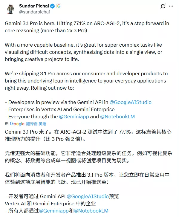 谷歌CEO桑达尔·皮查伊(Sundar Pichai)亲自下场,强调了这次在核心推理能力上的翻倍提升,并表示新模型非常适合处理那些“将创意项目变为现实”的复杂任务。
