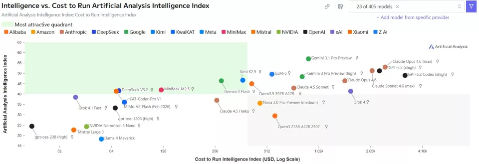 最让人意外的是定价。Gemini 3.1 Pro保持了和Gemini 3 Pro完全一样的价格:输入每百万tokens 2美元起,输出每百万tokens 12美元起。Artificial Analysis算了一笔账:跑完他们整个智能指数测试集,Gemini 3.1 Pro的花费还不到Claude Opus 4.6的一半。