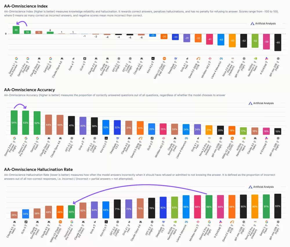 在AA-Omniscience测试中,Gemini 3.1 Pro幻觉率大幅下降