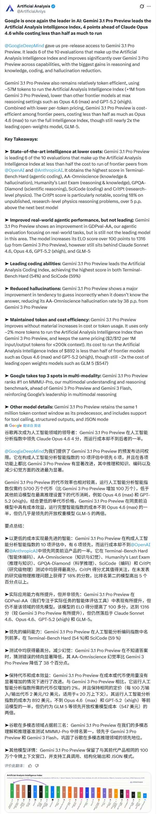 在Artificial Analysis的智能指数测试中,Gemini 3.1 Pro吊打对手