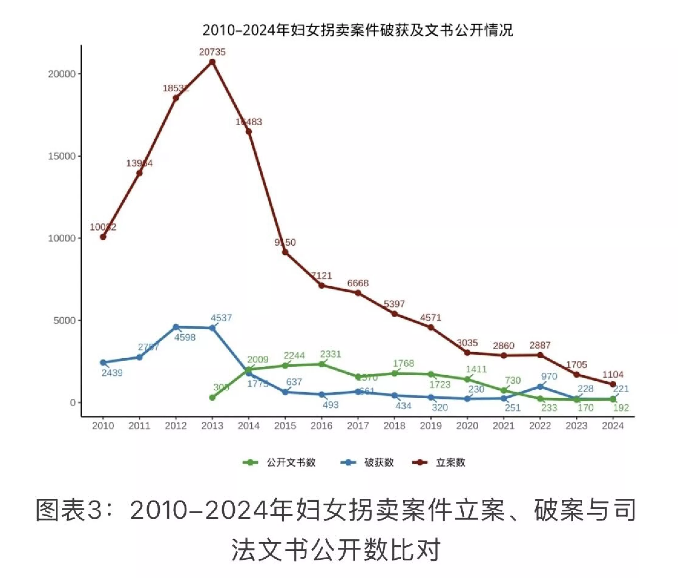 2024年官方公开的拐卖案件以单次犯案居多,多发地在农村,罪犯背景集中于中年及老年男性,教育水平多为初中及以下;而受害者多为女性,尤其是精神或心智障碍女性以及外籍女性。在铁链女事件发生的2022年,政府对拐卖妇女儿童类案件的打击与侦破有显著的提升,但22年以前及以后的力度都稍显不足,这可能与统计方法及口径、政府的执法与司法资源分配、拐卖案件治理结构变动有关,对此我们不得而知。