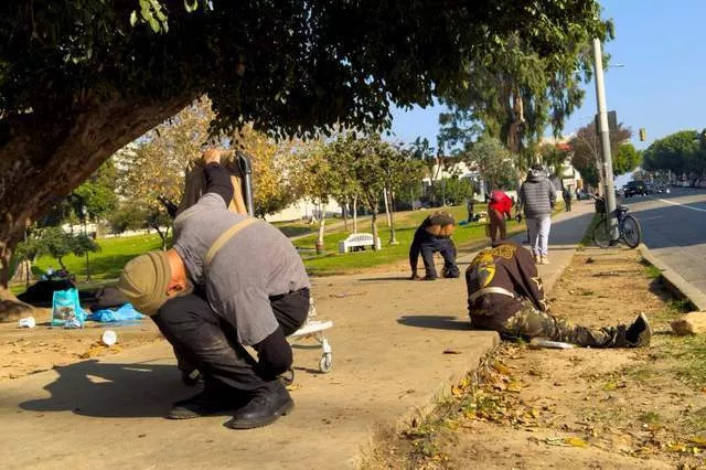 可如今的麦克阿瑟公园,早已没了当年的模样。现场图片显示,这位拄着拐杖、戴着墨镜的老兵,站在公园长椅旁,身旁就是熟睡的无家可归者;地上铺满了腐烂的食物、撕碎的衣物和破损的购物车,曾经绿草如茵的地方只剩下裸露的泥土,用过的针头随意散落,每一步都像踩在雷区,让年迈的雷焦步履维艰。空气中弥漫着恶臭,眼前的景象更像是城市崩溃后的残局,被当地民众称为“僵尸区”—— 大量无家可归的吸毒者聚集在此,让这里变得混乱不堪。