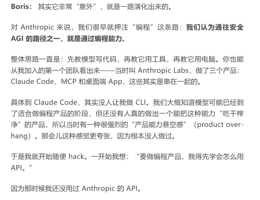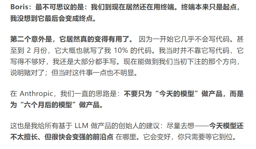 但这场对话最值得看的,并不是“又一个 AI 编程工具爆火”的故事,而是 Boris 如何把一个终端里的小聊天程序,迭代成今天这个能调工具、会 plan、甚至会主动找人沟通的开发 agent。