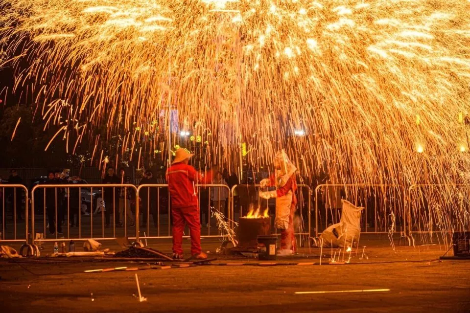此外,从安全机制上看,烟花更多依赖封装、引线、自动控制,而打铁花则需要人工操作高温铁水,危险系数更高,对表演者的技艺和经验要求极高。