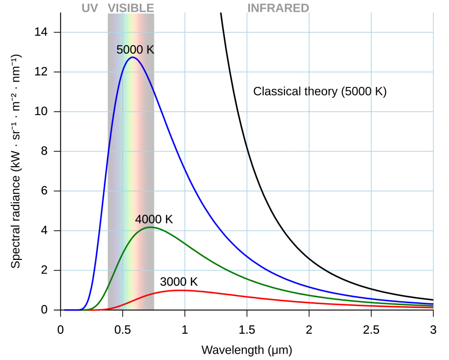 根据普朗克辐射定律,温度越高,辐射出的光波越短,颜色越接近白色。