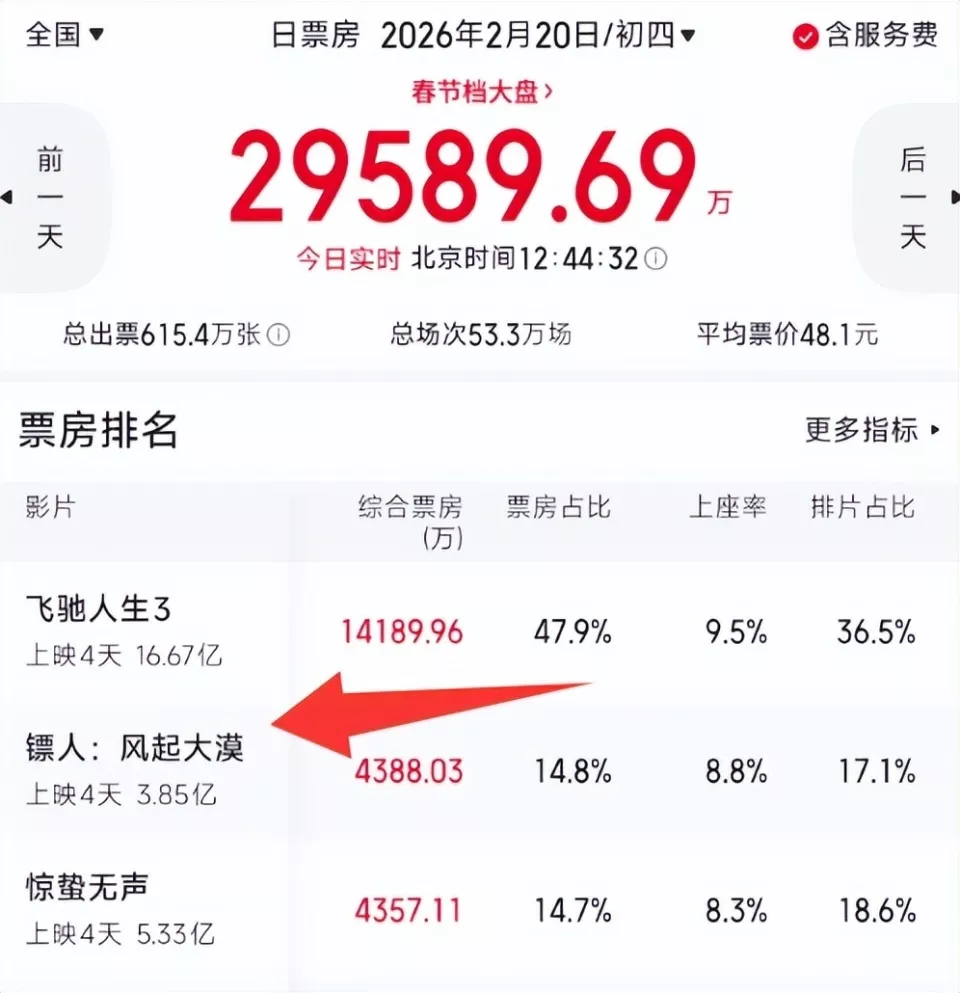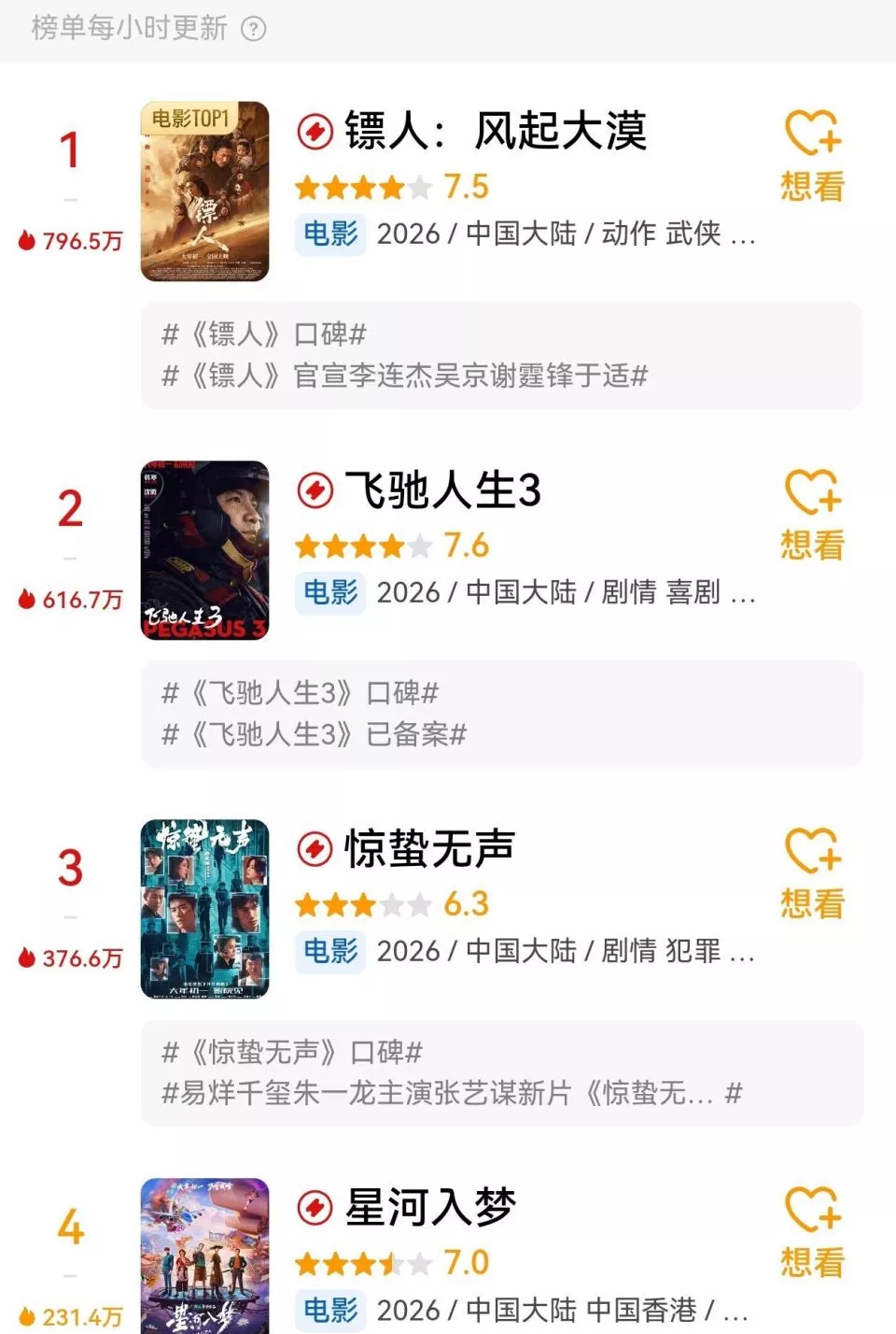 就在本稿发出去的同时,吴京主演的电影《镖人》首次反超张艺谋的《惊蛰无声》,从大年初一的第四名,一路赶超到了单日榜亚军的位置。