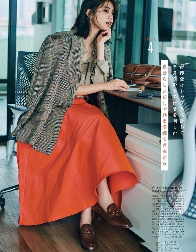 现在很多姐妹总是有一种“色彩羞耻症”,特别是大龄女性,总是害怕去穿亮色系的单品,不妨从下装开始尝试,比如说这件橘色半裙,搭配卡其衬衣,外搭格纹小西装,大地色和亮色碰撞,稳重不浮夸。