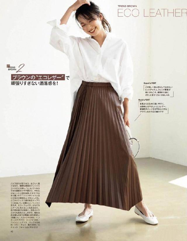 如果是职场的姐妹,一条白衬衣配卡其百褶裙,简单大方,早晨起来完全不用费脑想怎么搭配,这样穿搭任何外套都可以。