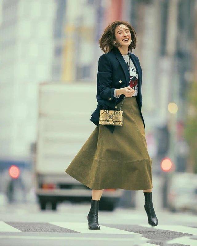 军绿色的半裙挺少见的,尤其是这种A字半裙,搭配卡通的T恤+黑色西装,想不到这种混搭风格穿出了不一样的气质,谁穿通勤不能穿卡通元素呢。