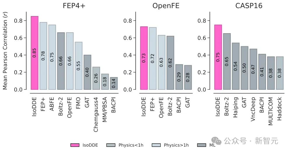 IsoDDE 在多个公开测试中不仅全面超过所有 AI 方法,甚至超过了 FEP,而且它根本不需要任何实验数据做起点。