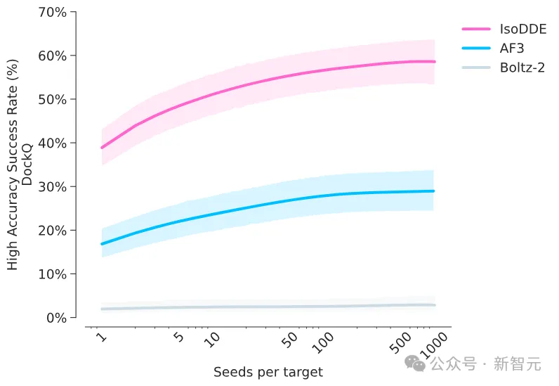 在预测抗体如何识别靶标这件事上,IsoDDE 的高精度预测成功率是 AlphaFold 3 的 2.3 倍,是另一个主流开源模型 Boltz-2 的近 20 倍。