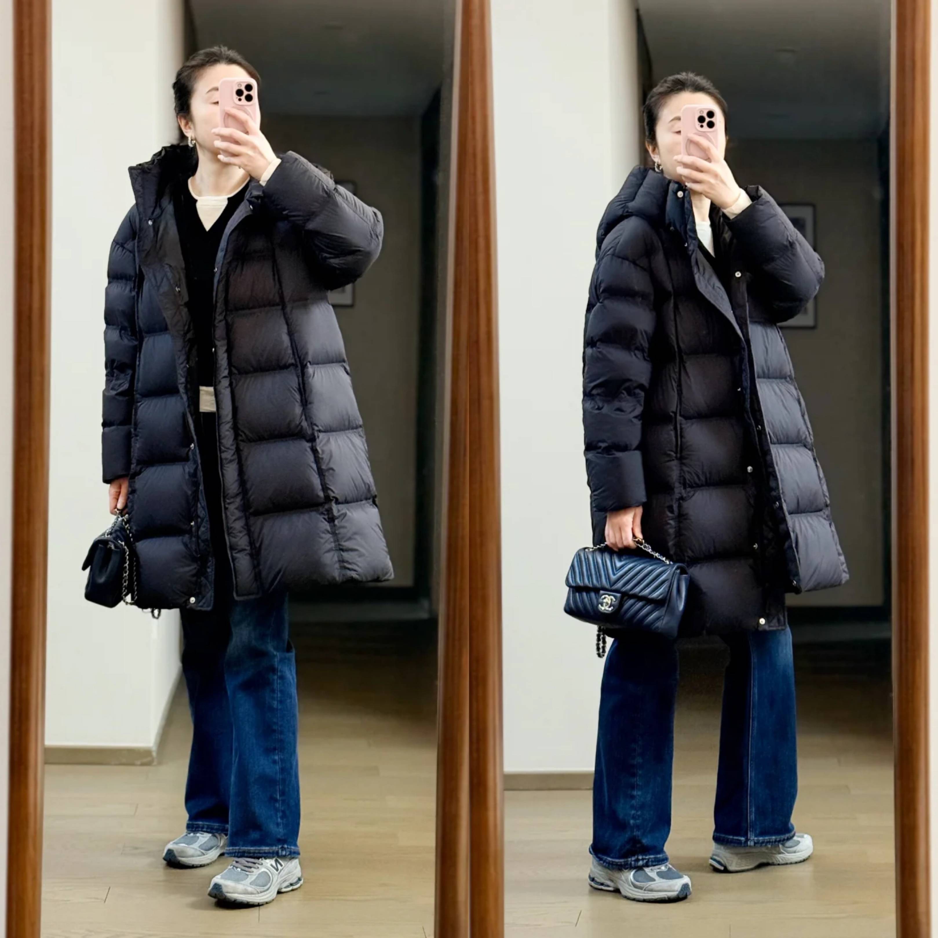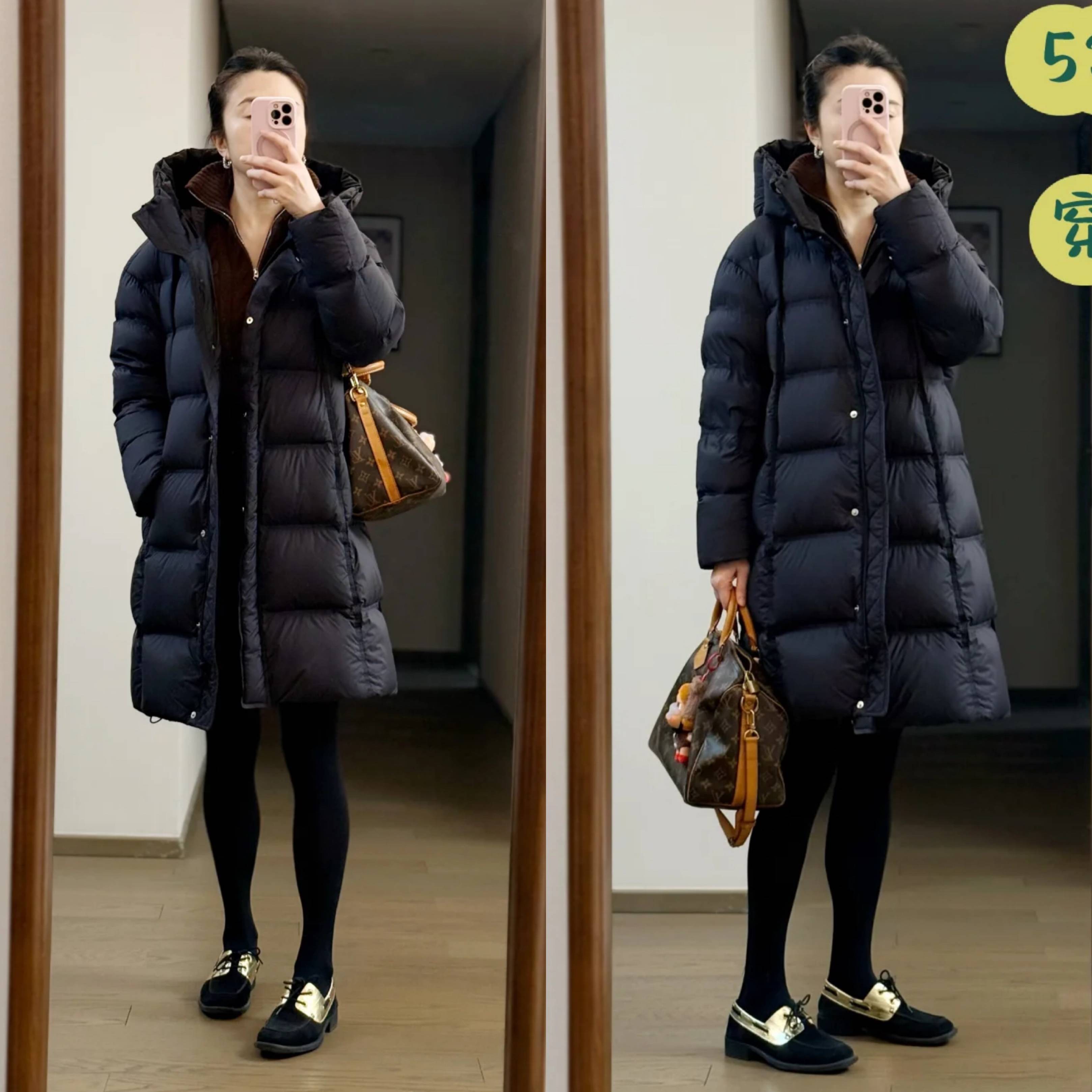 对于大龄女性来说,长款羽绒服保暖性更好,选择黑色准没错,首先黑色百搭且在视觉上有一定的收缩性,不会显胖,至于内搭推荐修身的版型,可以配合白色打底衫叠穿,衬肤色还有层次感,下半身搭配蓝色牛仔直筒裤+运动鞋,整体造型非常的休闲减龄。