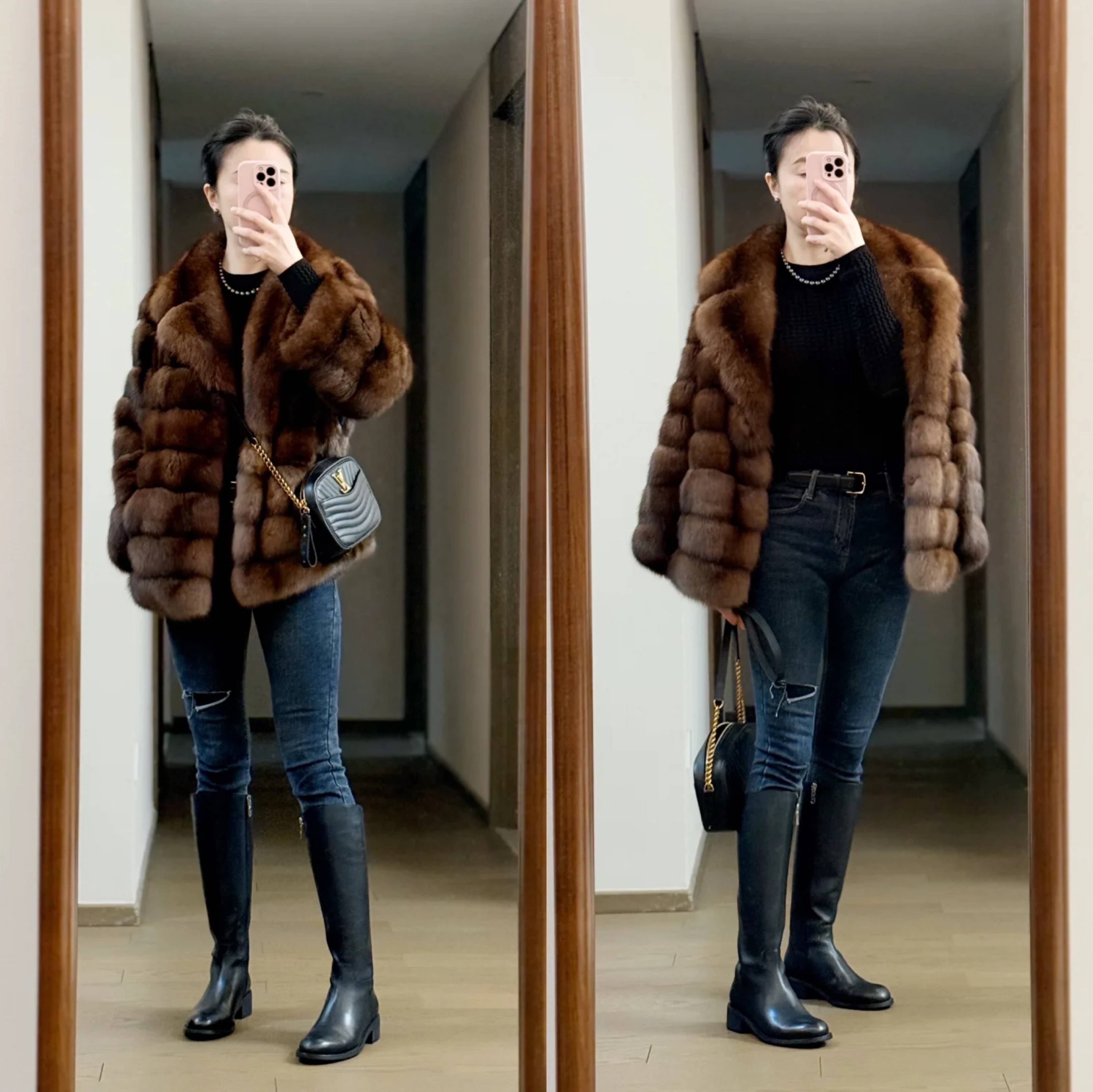 比如深棕色皮草外套内搭修身的黑色毛衣打底,下半身选择高腰牛仔铅笔裤+长筒靴,上宽下窄的穿搭遮肉显瘦效果非常好,冬天这么穿,时髦减龄又显得贵气十足,非常适合50+的女性。