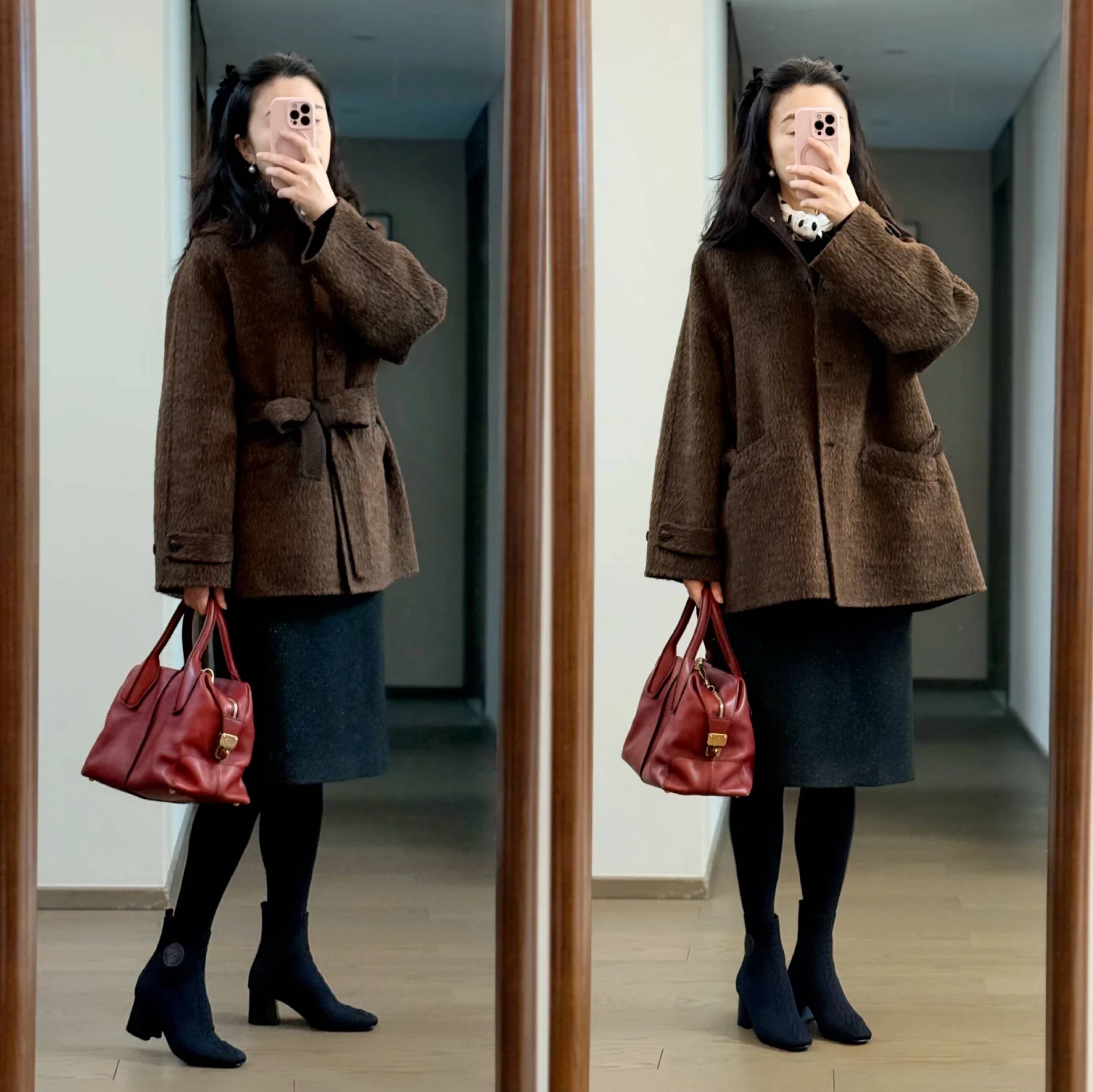 短外套+半身裙绝对是冬季穿搭最温柔的组合,中长款的毛呢短外套+黑色及膝半裙,黑色打底裤+黑色短靴,可以选择腰带来勾勒出高腰线,显瘦显高又优雅高级。