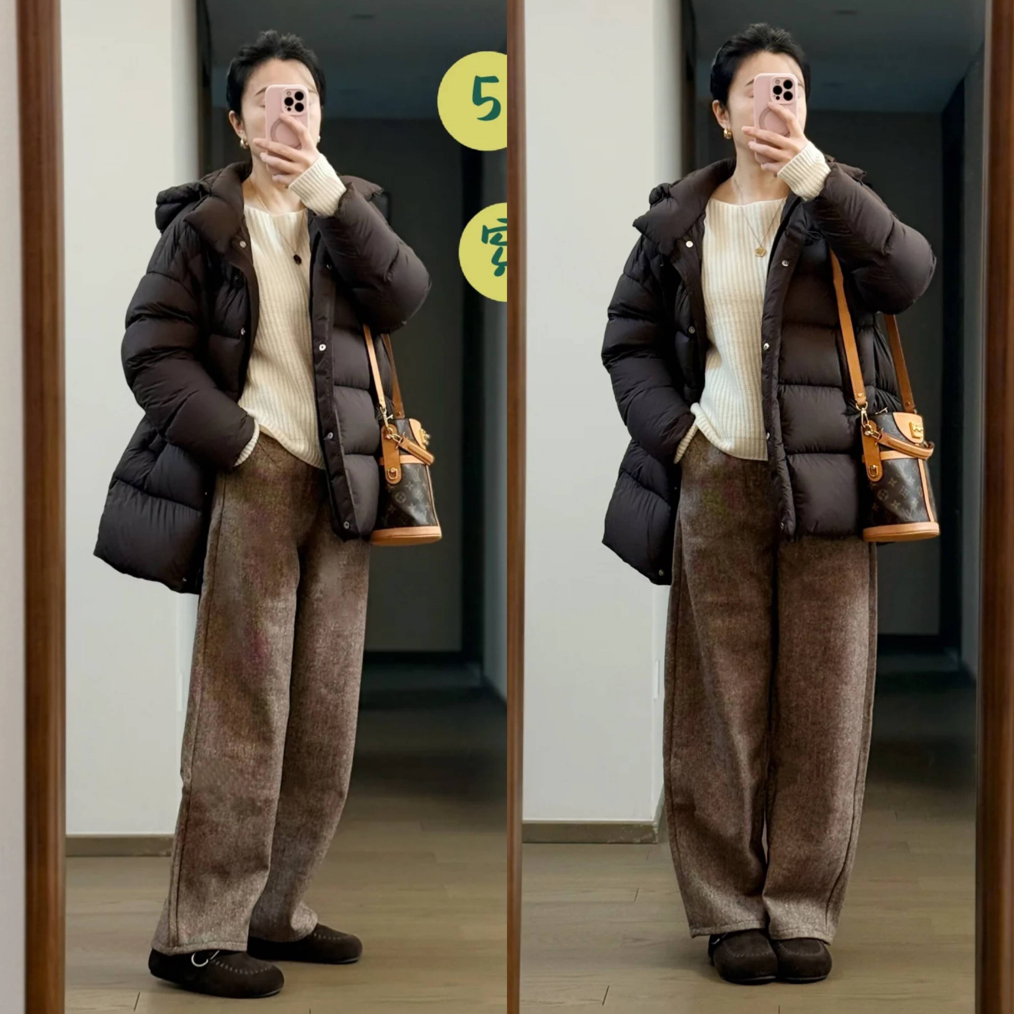 羽绒服+裤装简单大气又有很好的保暖性,偏胖的身材可以学博主,选择版型较为宽松的羽绒服,内搭浅色毛衣打底,下半身选择窄版阔腿裤,打造冬季松弛感穿搭。