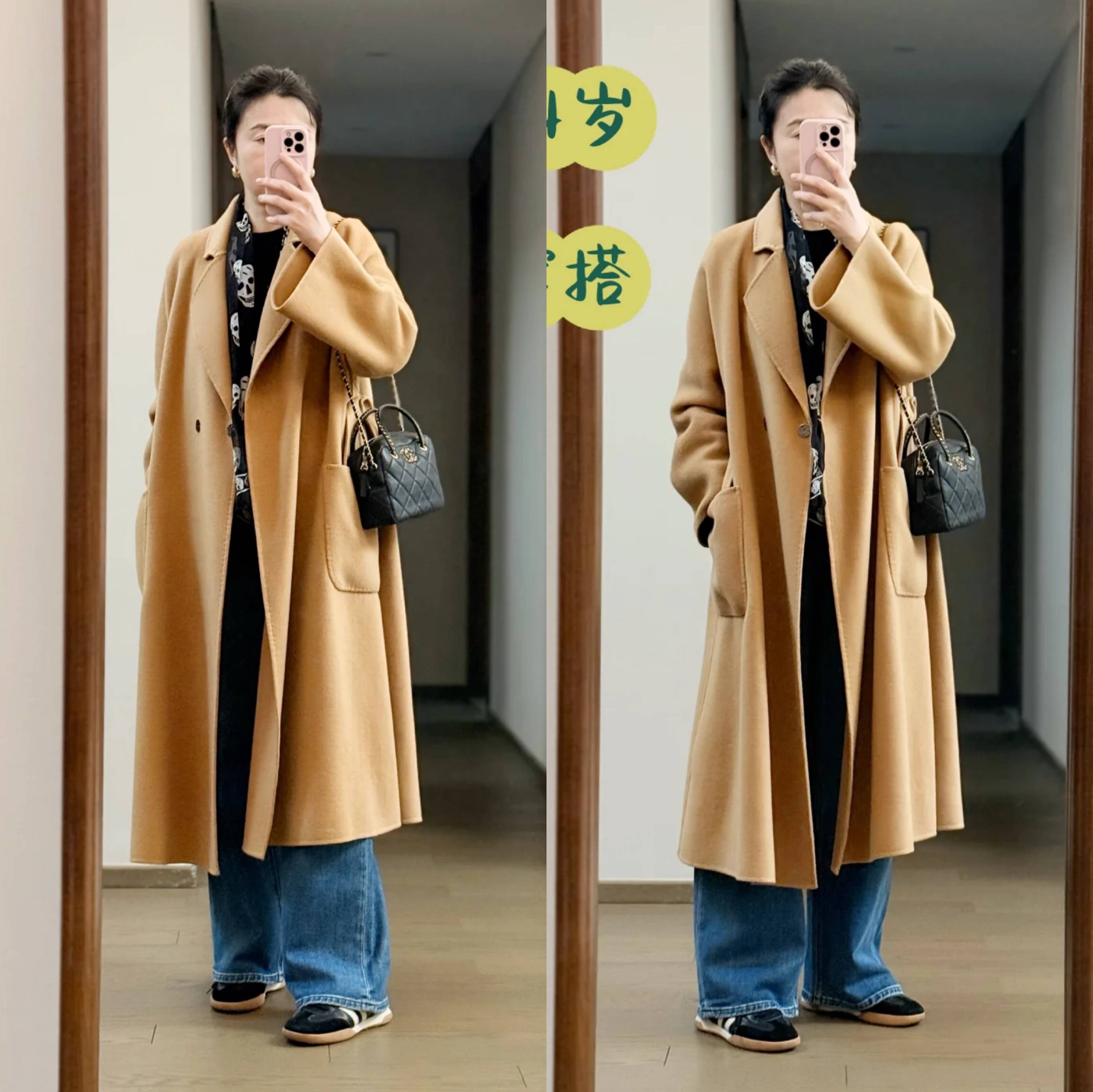 驼色长款大衣,博主选择的是略微宽松的H版型,加上大口袋的设计,简约又实用,内搭选择黑色的修身毛衣打底,下半身搭配蓝色牛仔直筒裤,用一条印花围巾点缀,鞋子推荐舒适的平底鞋或者运动鞋,整体造型休闲舒适。