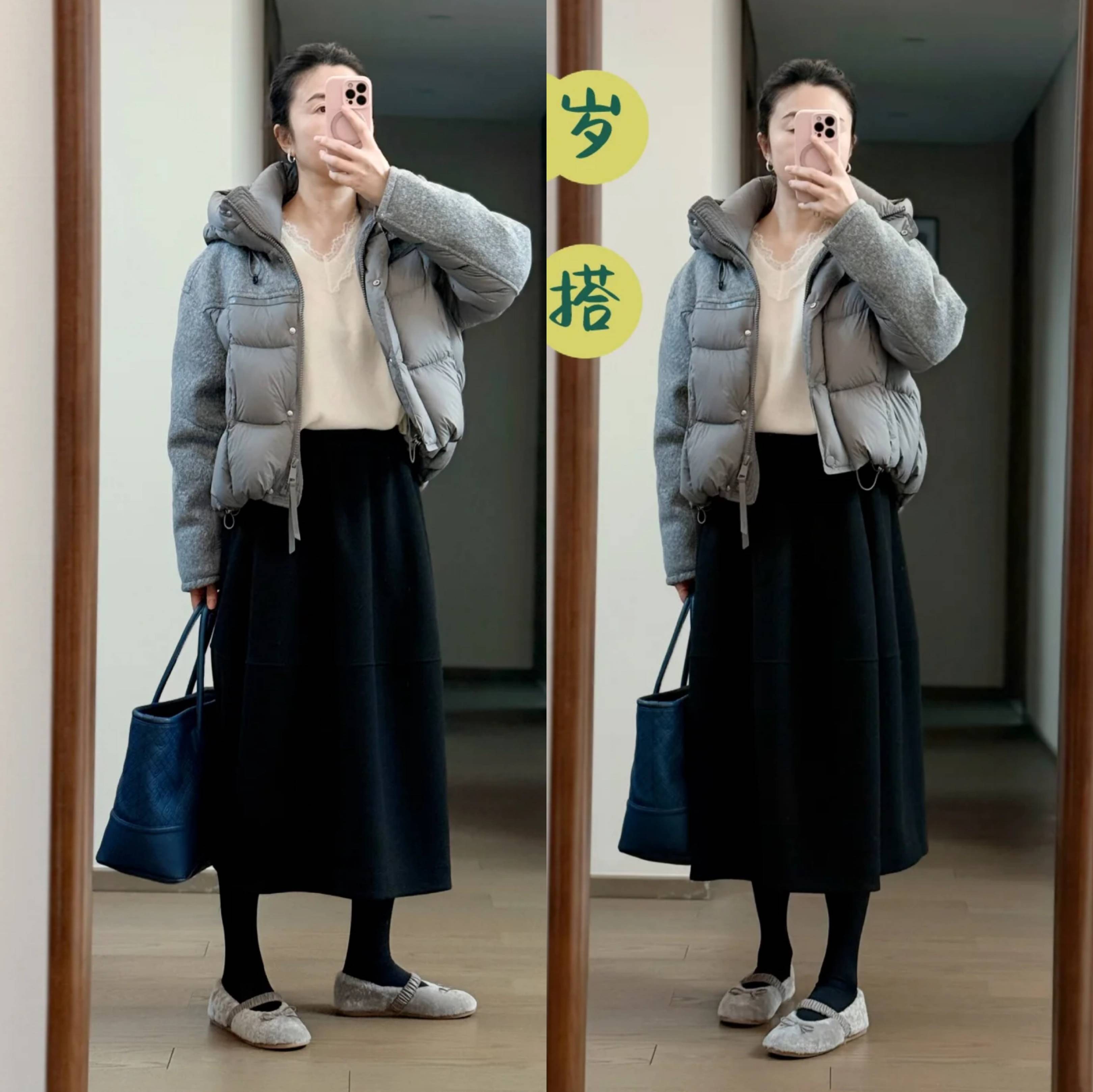 羽绒服与半身裙的组合超级温柔,选择版型较短的灰色羽绒服,内搭白色V领打底衫,下半身搭配黑色毛呢伞裙,裙摆长度尽量控制在露出小腿三分之一的长度,无论是搭配短靴还是平底鞋,都超级显瘦,可以根据气温选择围巾,保暖又有氛围感哦!