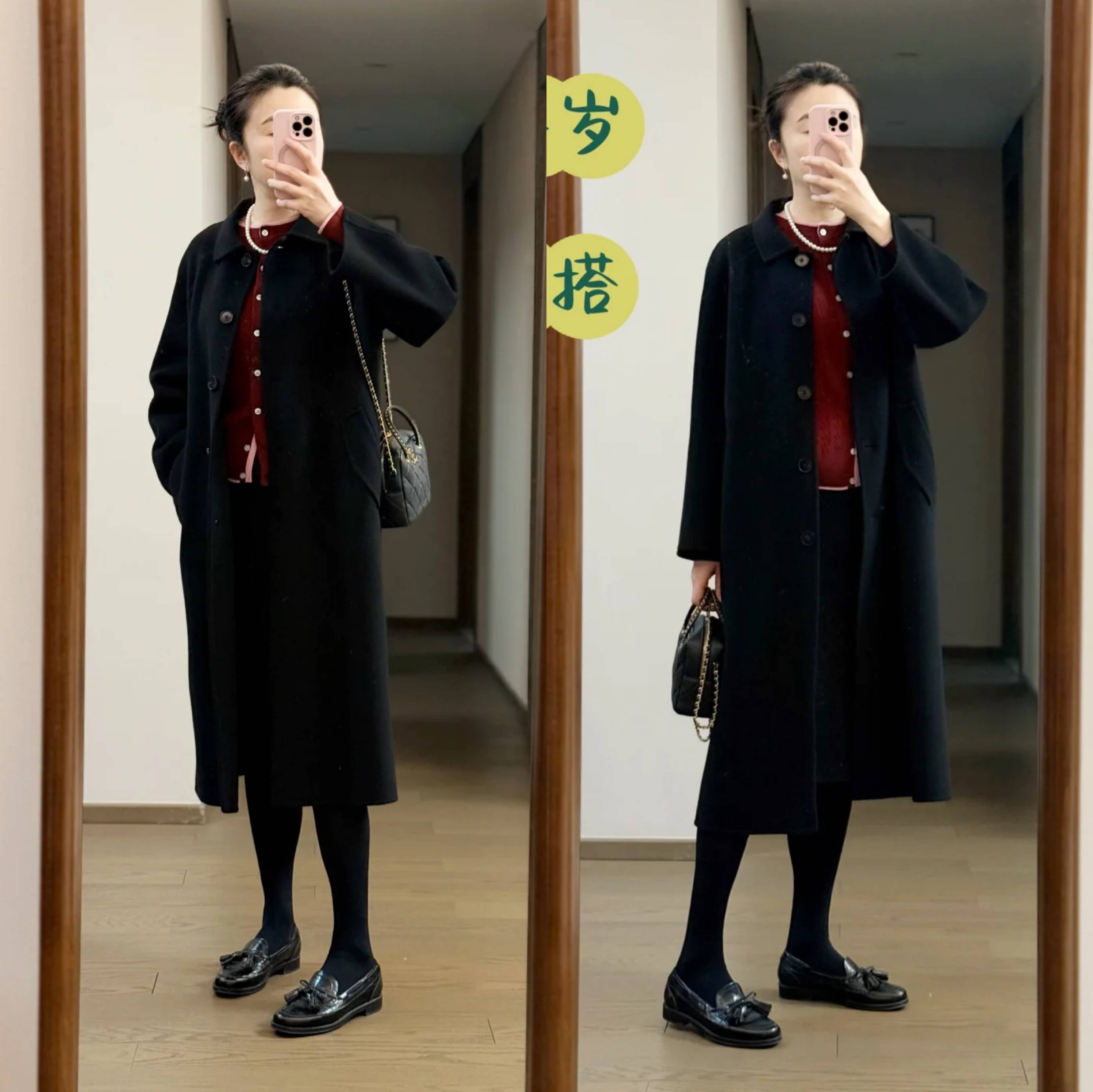 对于身材偏胖的女性来说,大衣+半身裙的组合绝对是冬季必选的,黑色长款大衣内搭暗红色开衫叠穿打底衫,下半身选择毛呢半身裙+黑色打底裤,推荐搭配乐福鞋,领口可以搭配一条珍珠项链来增加精致度,整体搭配组合简约低调又不会有沉闷感。