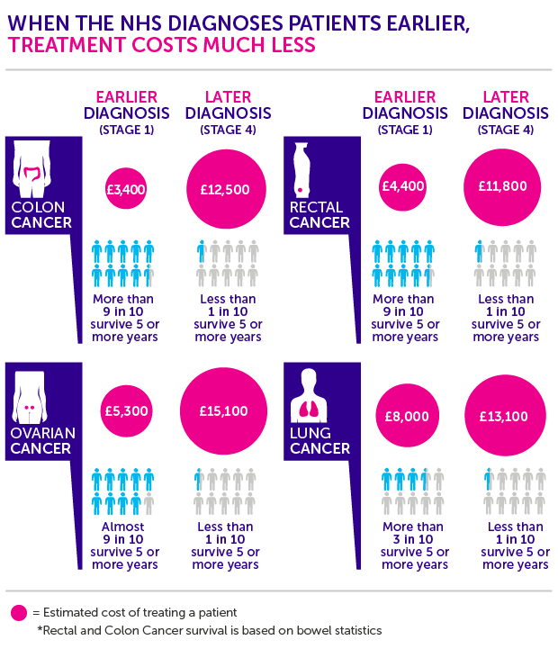 有研究表明,仅是2010年,因为医疗支出和生产力损失而导致的全球癌症年度经济代价总额为1.16万亿美元。而有效的早期诊断可帮助在癌症的早期阶段及时诊断,使治疗通常更有效,更简单,费用也更低。更多的研究表明,对于很多类型的癌症,如果手术和其它治疗手段在肿瘤已经转移之前就开始实施,则效果非常显著,而且早期诊断的癌症治疗费用比晚期诊断的治疗费用要低二至四倍。