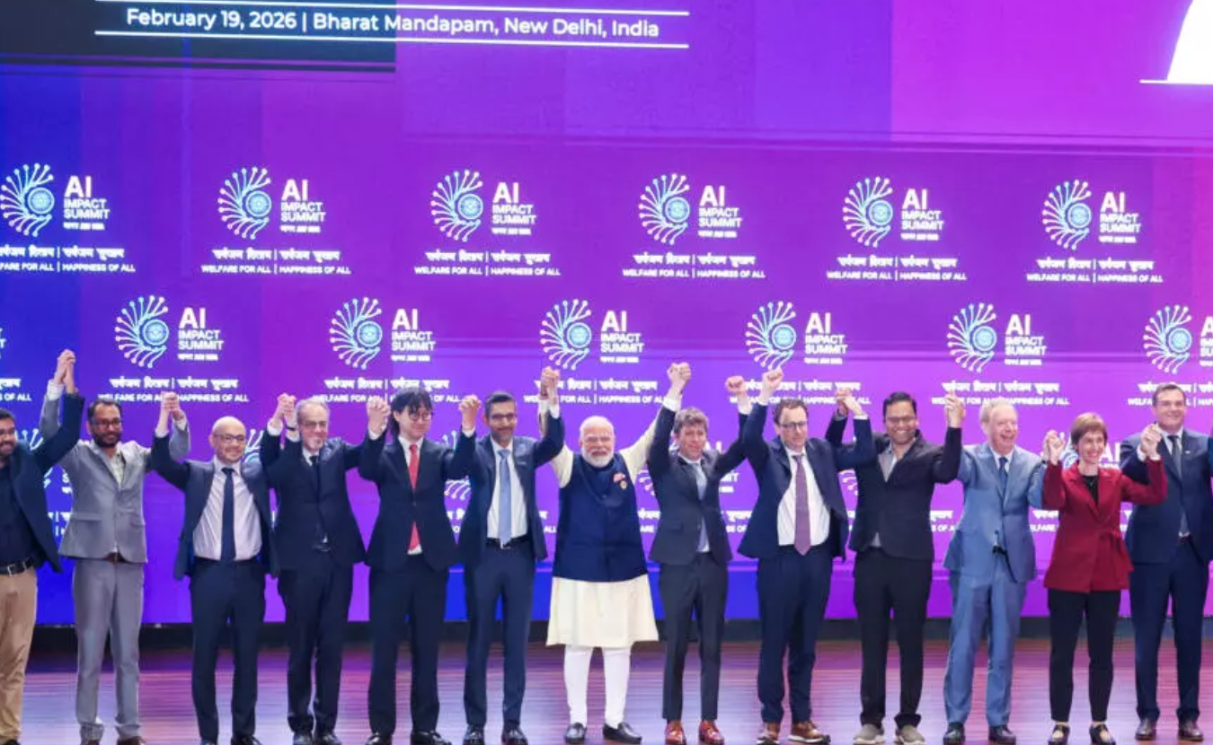 2026 年 2 月 19 日,在印度新德里举行的 AI 影响峰会上,印度总理纳伦德拉·莫迪与谷歌和 Alphabet 首席执行官桑达尔·皮查伊、OpenAI 首席执行官萨姆·奥特曼、Anthropic 首席执行官达里奥·阿莫迪以及其他全球科技领袖合影。 via REUTERS - PRESS INFORMATION BUREAU