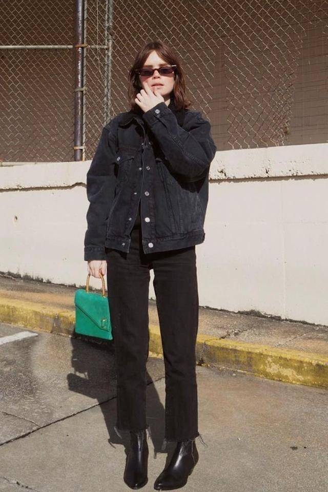 一身黑的穿搭,若想要摆脱单调,就要利用材质、配饰、剪裁形成差异化,才能让造型更丰富。