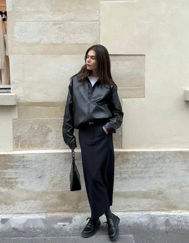 皮衣的酷飒,邂逅长裙的浪漫,二者形成对比,内搭白T恤,立马丰富造型,穿出了别具一格的美。