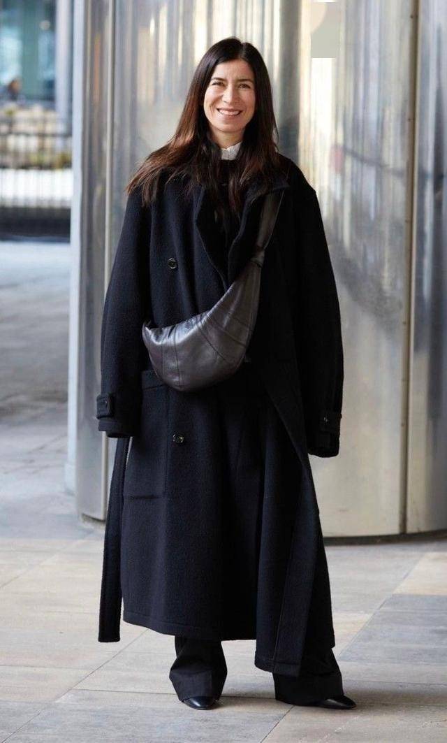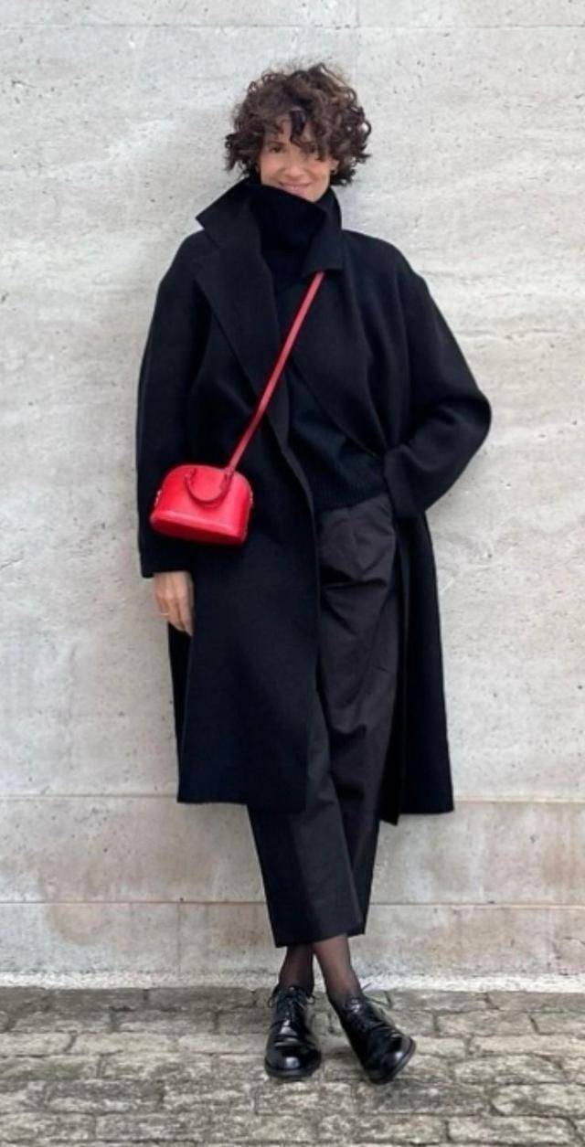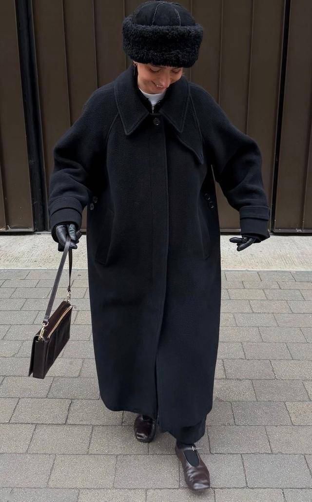 及脚踝长度的黑色大衣,上身超有安全感,利落的剪裁,修饰出挺拔的身形,照样很高级。